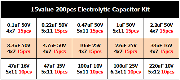 15 kinds of capacity 200PCS electrolytic capacitor element package with box 0.1~220uF